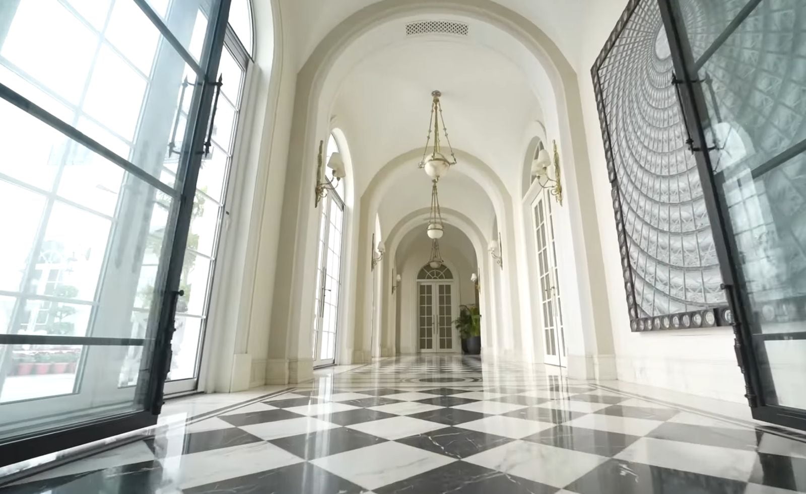 The entry opens to a magnificent Great Room topped with high ceilings and exposed wood beams. A striking black and white checkered floor creates graphic tension against plush ivory sofas and heirloom-style rugs. Sunlight streams in through towering glass panels, making the spacious interiors airy rather than imposing. Despite the grandeur, the environment remains habitable. Wide hallways flow organically into intimate spaces, proving that luxury doesn't have to be loud to be long-lasting.