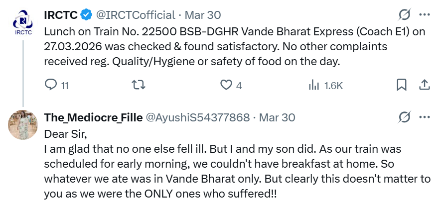 However, the IRCTC has responded with a strong defense. They responded to your complaint on X, saying that they had inspected the food and that it was “satisfactory.” Additionally, they mentioned that out of an entire passenger train, no one else reported getting sick or having hygiene problems that day.